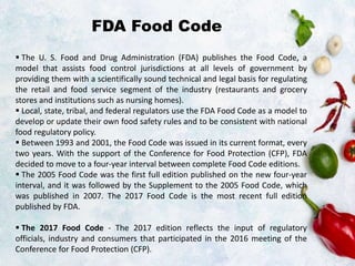 The FDA Food Code is not federal law. The Food Code will be effective only if the non-federal governments that have adopted the Food Code and are responsible for administering the Food Code are prepared to perform that. It represents FDAs best.